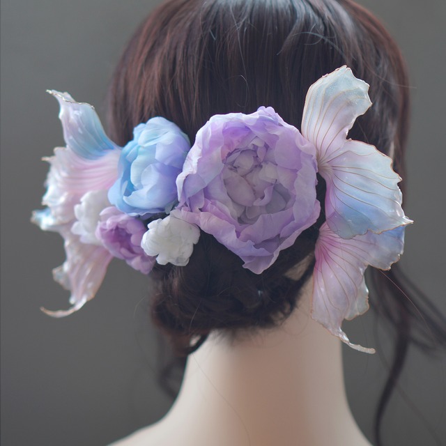 【受注生産】 ★ご購入の前にお読みください★ https://marchencat.handcrafted.jp/p/00001 こちらのお得なセット販売になります。 特徴や詳細は各ページをご覧になってください。 大切に箱にお入れしてお届けいたします。※箱の種類や色は選べません。 ********** 1つ1つ丁寧に着色し、形成しています。 全てを手作業で行っておりますため、同じ道具を使っていましても色や形は1つ1つ違います。 左右も全く同じにはなりません。 世界にたった一つのオーダーメイドとして、個性を楽しんでいただけますと幸いです。 ******** 髪飾りセット(二本軸4個セット) 上ひれ:約90mm・70mm 下ひれ:約90mm・80mm ピンサイズ:65mm ※挟むタイプのクリップに変更できます。オプションよりご選択ください。 髪飾りセット(コーム1・二本軸3の4個セット) コーム全長:約75mm*40mm 芍薬花:約80mm・55mm 菊花:約35mm・30mm ピンサイズ:65mm 素材:メッキ金具・布(キュプラ・レーヨン)・樹脂(ディップ液・UVレジン) 箱に入れてお届けします。 ********