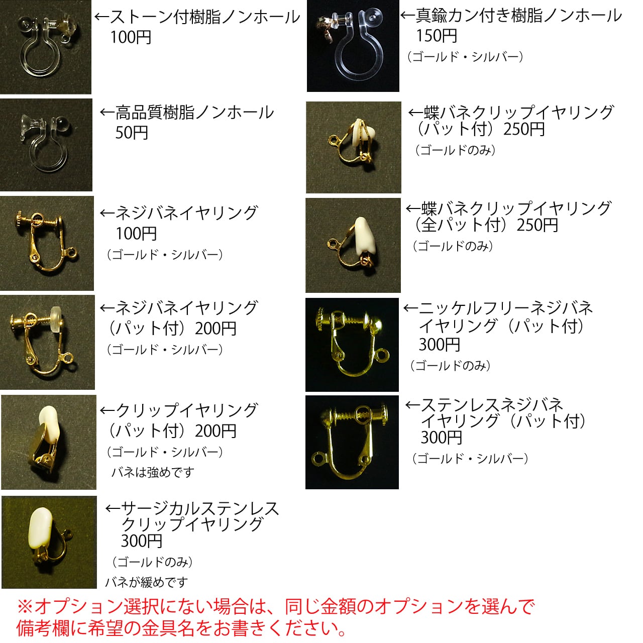 アレルギーの方はサージカルクリップイヤリングをご選択ください。